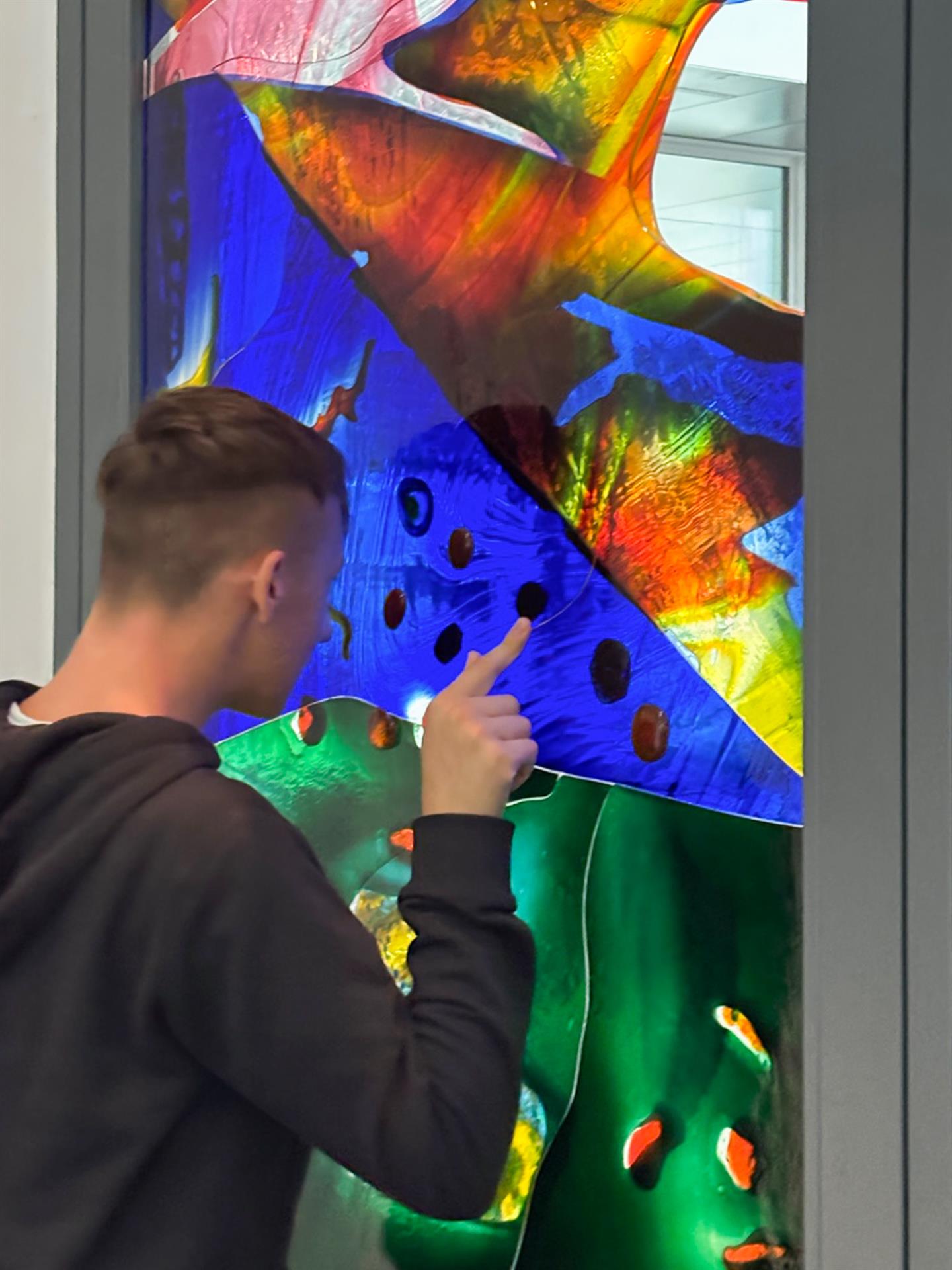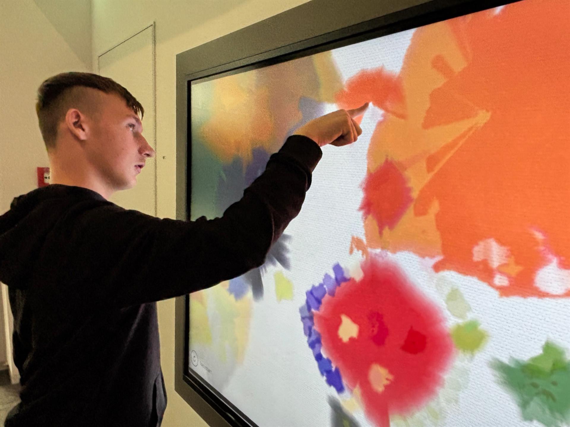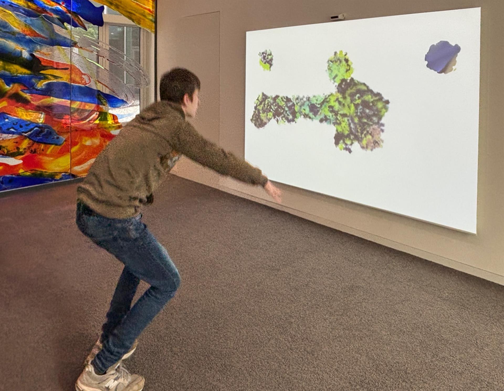 Im Anschluss an die Führung besuchten die Schüler:innen das Farblabor des Museums, in dem sie selbst kreativ werden konnten. An digitalen Wänden experimentierten sie mit Farben, Formen sowie Bewegung und gestalteten eigene Kunstwerke, die sie mit Titeln wie „Die Katze steht Kopf“ oder „Die Raupe“ versahen. Diese Arbeiten sind nun auf einem Bildschirm im Museum zu sehen: ein besonderes Erlebnis für die jungen Künstler:innen.