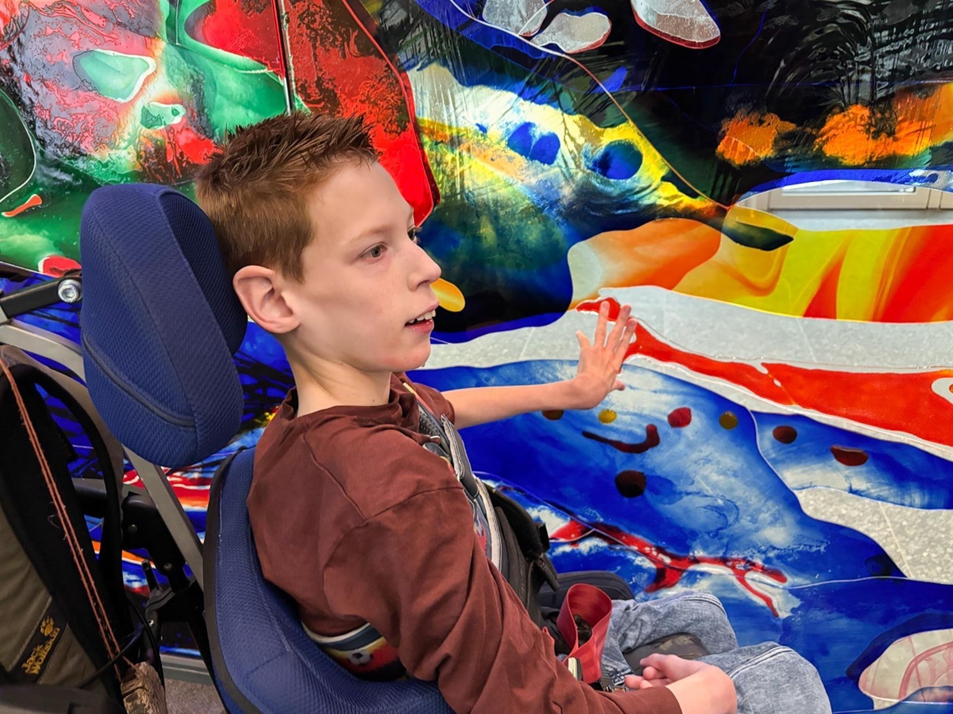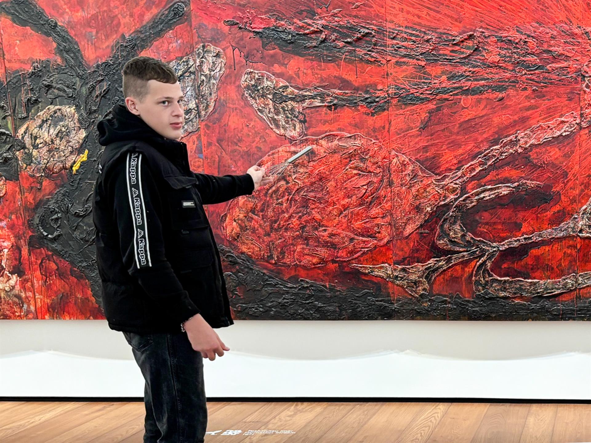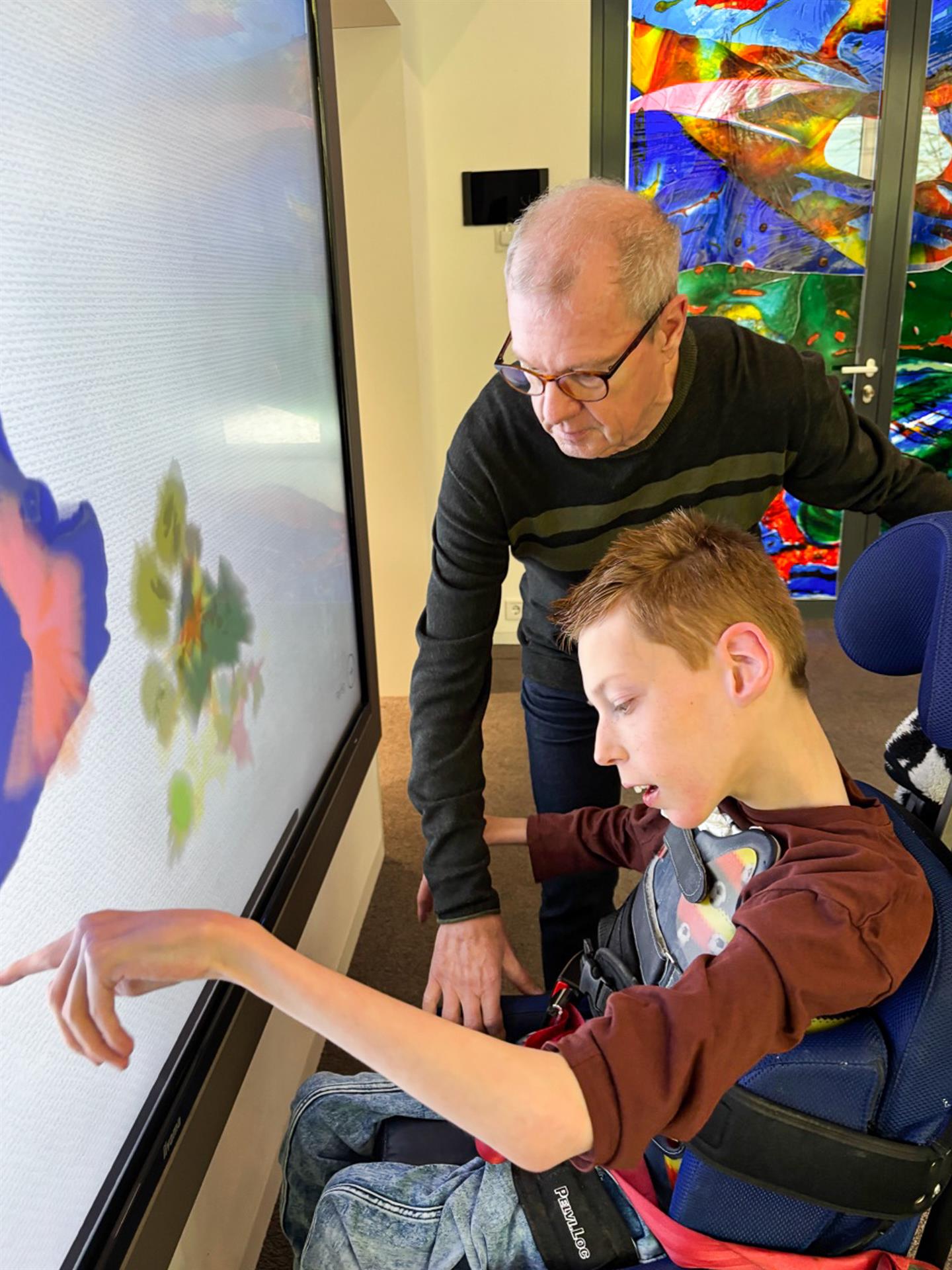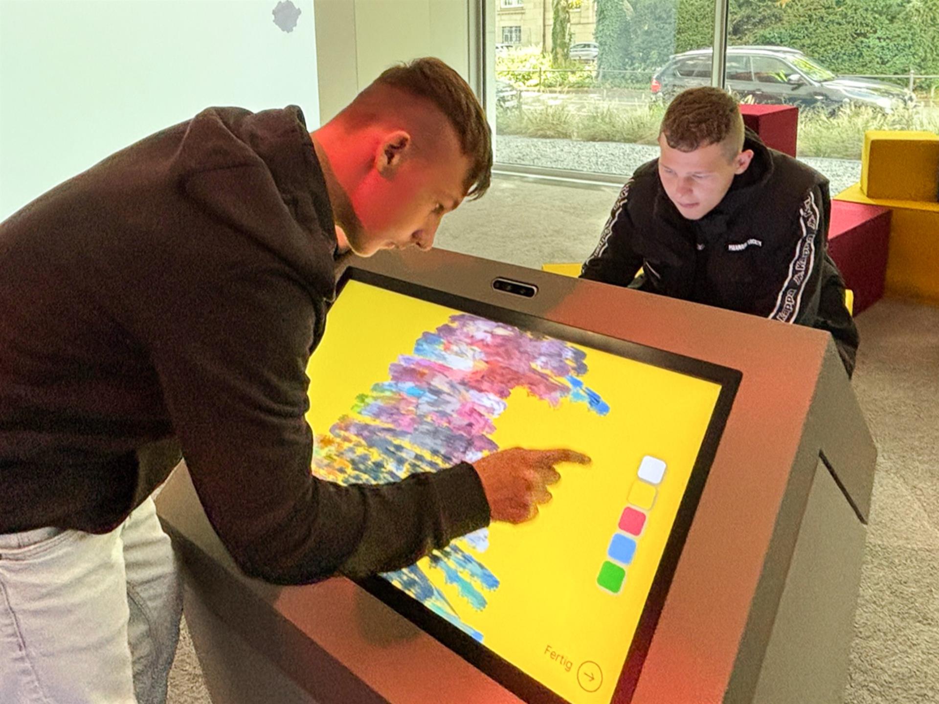 Im Anschluss an die Führung besuchten die Schüler:innen das Farblabor des Museums, in dem sie selbst kreativ werden konnten. An digitalen Wänden experimentierten sie mit Farben, Formen sowie Bewegung und gestalteten eigene Kunstwerke, die sie mit Titeln wie „Die Katze steht Kopf“ oder „Die Raupe“ versahen. Diese Arbeiten sind nun auf einem Bildschirm im Museum zu sehen: ein besonderes Erlebnis für die jungen Künstler:innen.