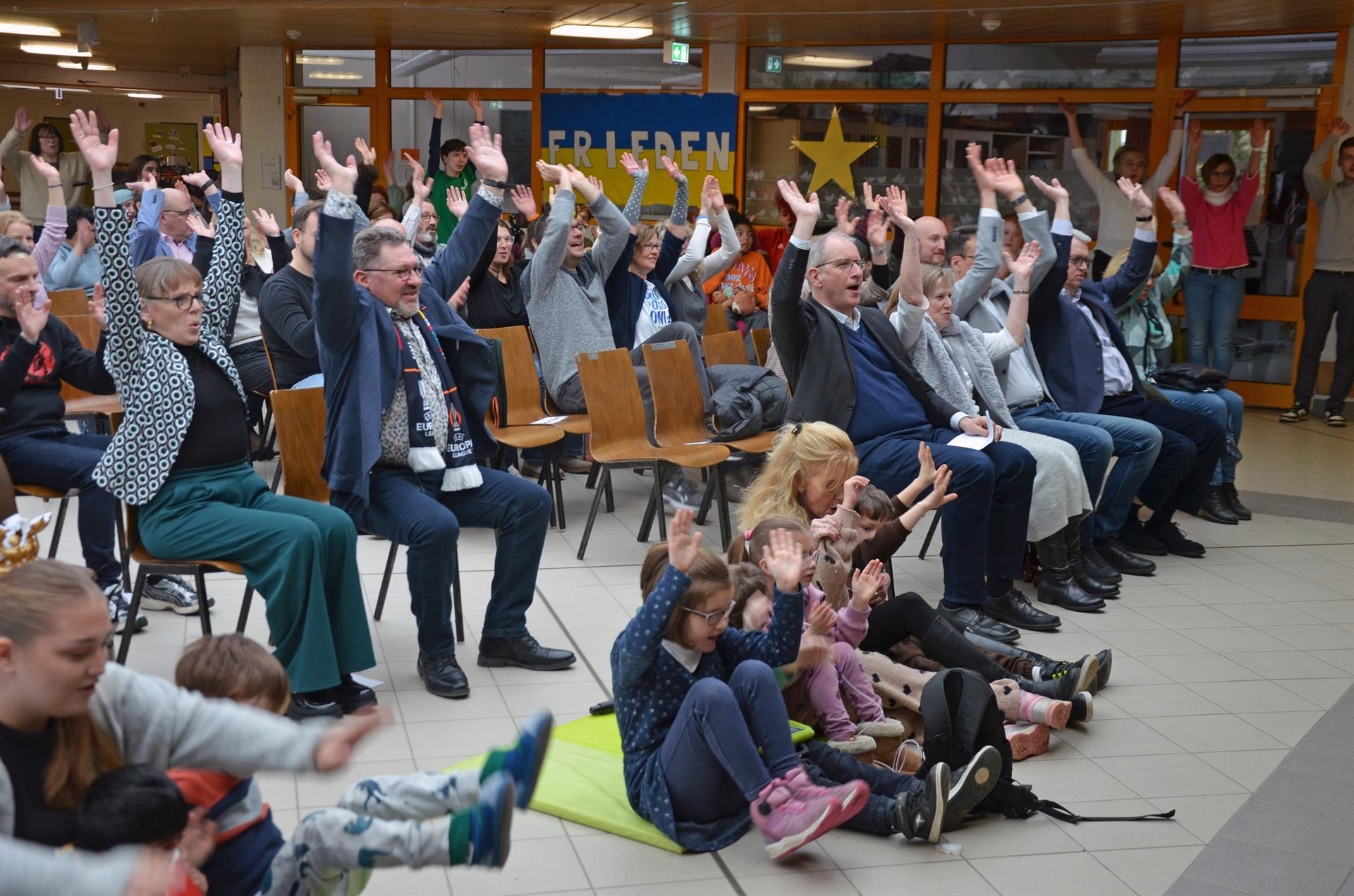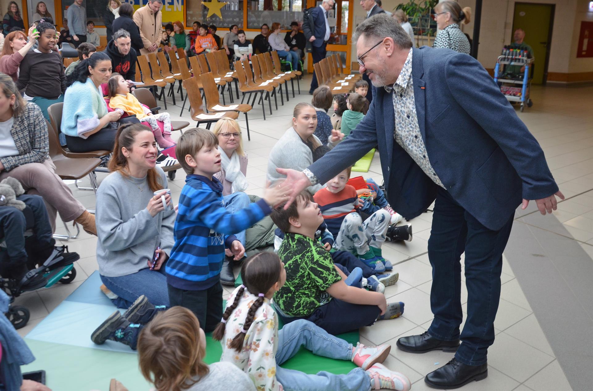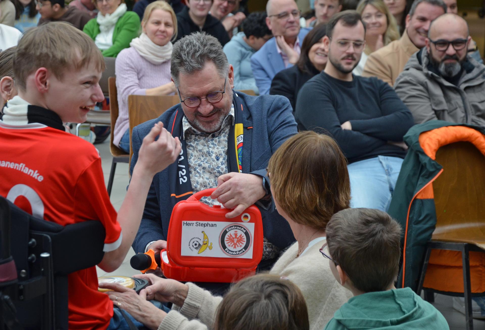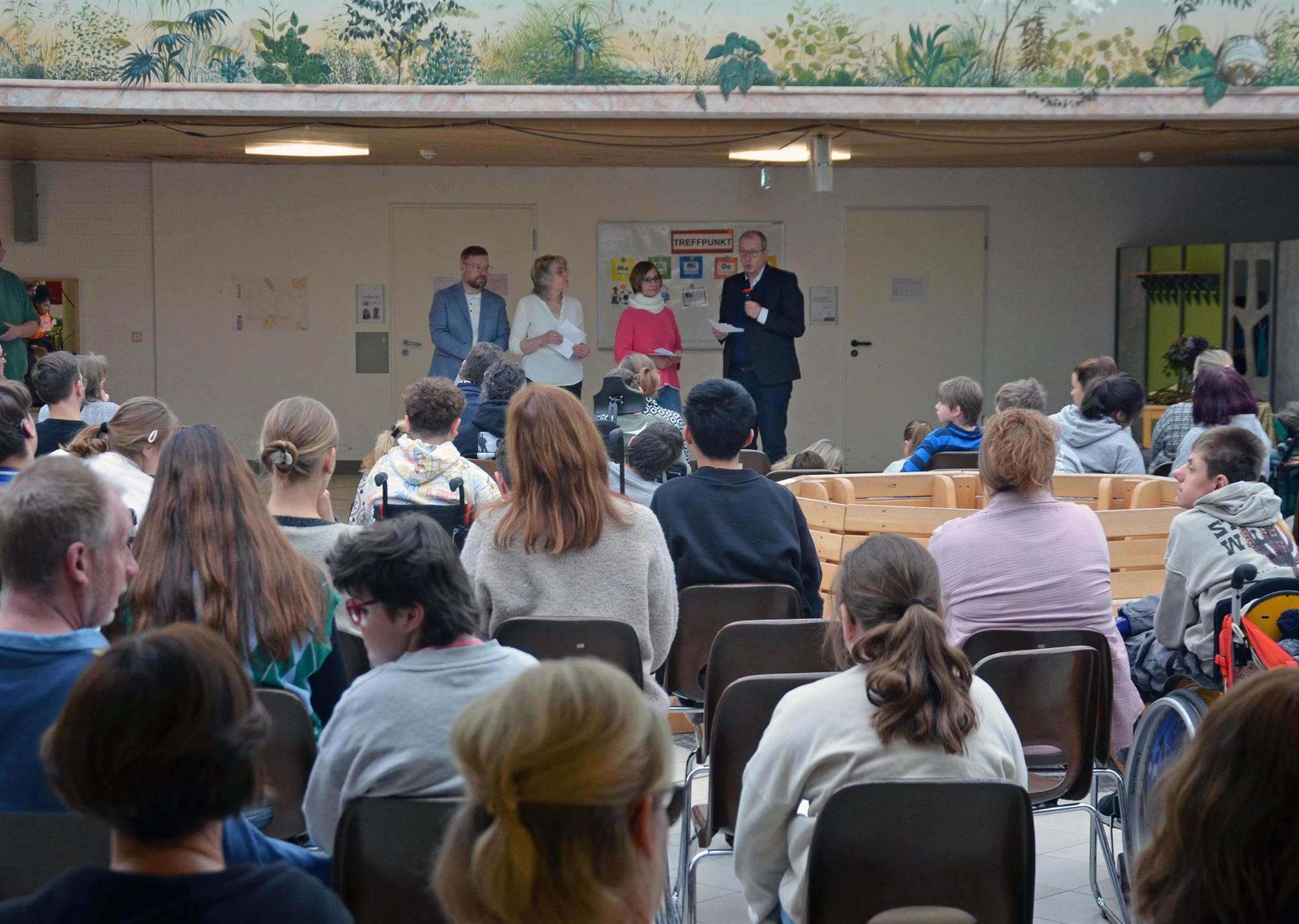 Zur offiziellen Verabschiedung sprachen auch unter anderem Ministerialrat Herr Daniel Bognar (Koordinierender Referatsleiter für Grundschulen, Förderschulen und Inklusion) sowie Frau Kutschinski vom Staatlichen Schulamt Rüsselsheim. Herr Bognar führt in seiner Rede aus: „Herr Ralf Stephan war für die Schulaufsicht immer ein verlässlicher Partner, der mit großem Herzblut und großem pädagogischem Sachverstand die Förderung jeder einzelnen Schülerin und jedes einzelnen Schülers im Blick hatte. Die Ernsthaftigkeit und Sorgsamkeit mit der die in der Peter-Josef-Briefs-Schule tätigen Pädagoginnen und Pädagogen die Bildung, den Unterricht und die Erziehung, diskutieren und gestalten, ist beeindruckend und maßgebend. Diese Qualität der Förderung ist ein Anspruch, den Herr Stephan als Schulleiter mit seinem Team als Leitbild im Alltag verfolgt und unterstützt hat.“ Doch die Zeit war nicht immer einfach, wie Bognar fortführte: „Die Herausforderungen für Herrn Stephan waren besonders hoch. Er musste mit seinem Kollegium gemeinsam viele davon meistern: Ob es eine sich in kurzer Zeit verändernde Schülerschaft, ob es die Integration vieler neuer Mitarbeiterinnen und Mitarbeiter war, ob es dass Schulraumkonzepte für eine rasant ansteigende Schülerschaft war, ob es die Einführung neuer digital-gestützter pädagogischer Möglichkeiten oder orthopädisch-therapeutischer Fortschritte war, ob es die Bewältigung der Pandemie war, alle diese und viele weitere Herausforderungen hat er angenommen, sich dabei reingekniet und sie gemeinsam mit der Schulgemeinde gemeistert. Aus der regionalen und obersten Schulaufsicht danken wir herzlich für das gelungene Zusammenwirken in vielen Fragen und bei vielen Anlässen. Stets war das Wohl unserer Schülerinnen und Schüler im Blick und die Elternarbeit. Persönlich wünsche ich Ralf Stephan von Herzen alles Gute, Gottes Segen und viel Freude mit seiner Familie.“