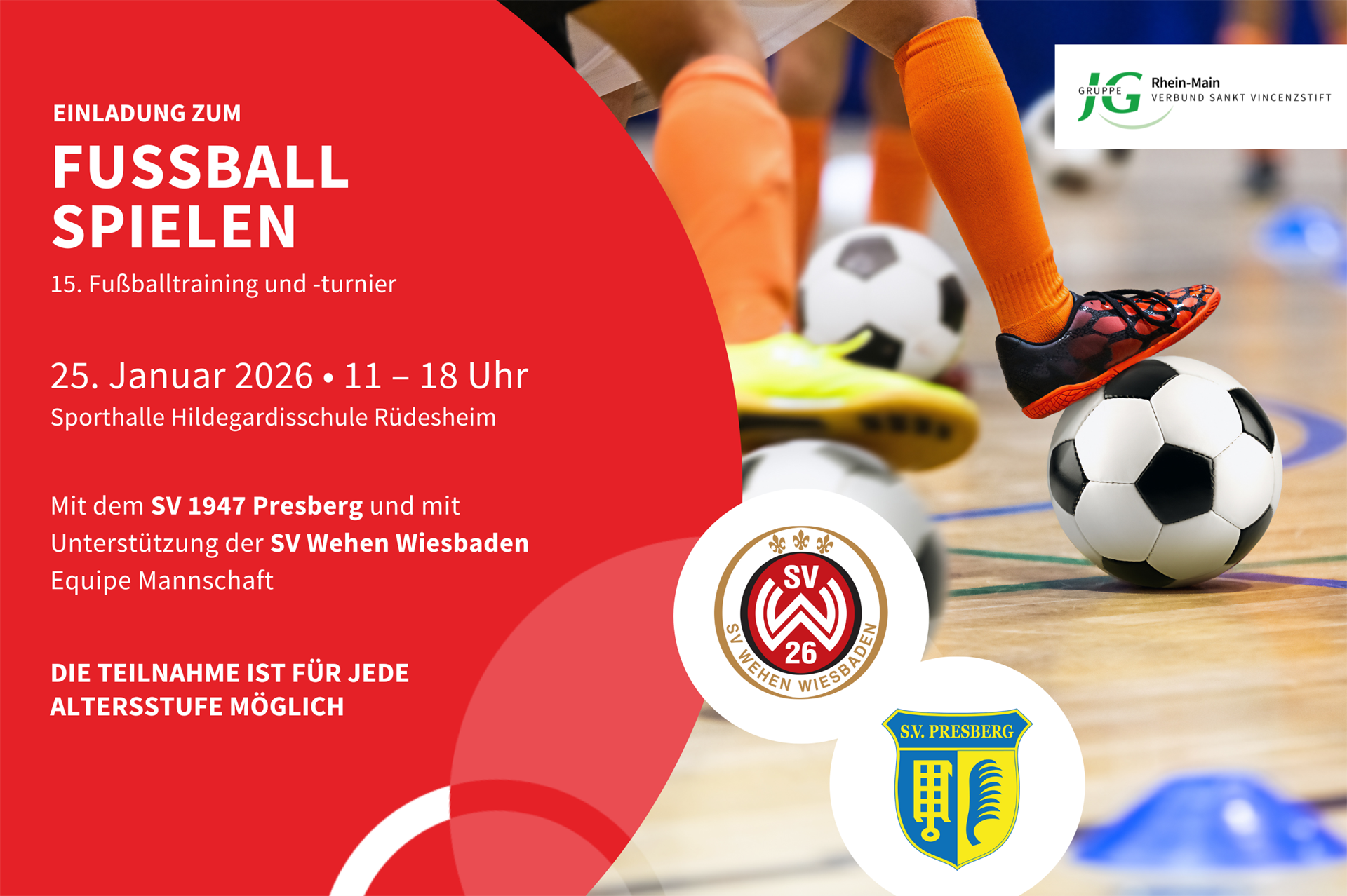 Rüdesheim, 25. Januar 2026 – Am Sonntag, den 25. Januar, lädt das Sankt Vincenzstift gemeinsam mit dem SV 1947 Presberg und der SV Wehen Wiesbaden Equipe Mannschaft zum 15. Fußballtraining und Turnier ein. Von 11 bis 18 Uhr dreht sich in der Sporthalle der Hildegardisschule Rüdesheim alles um Bewegung, Teamgeist und gelebte Inklusion.