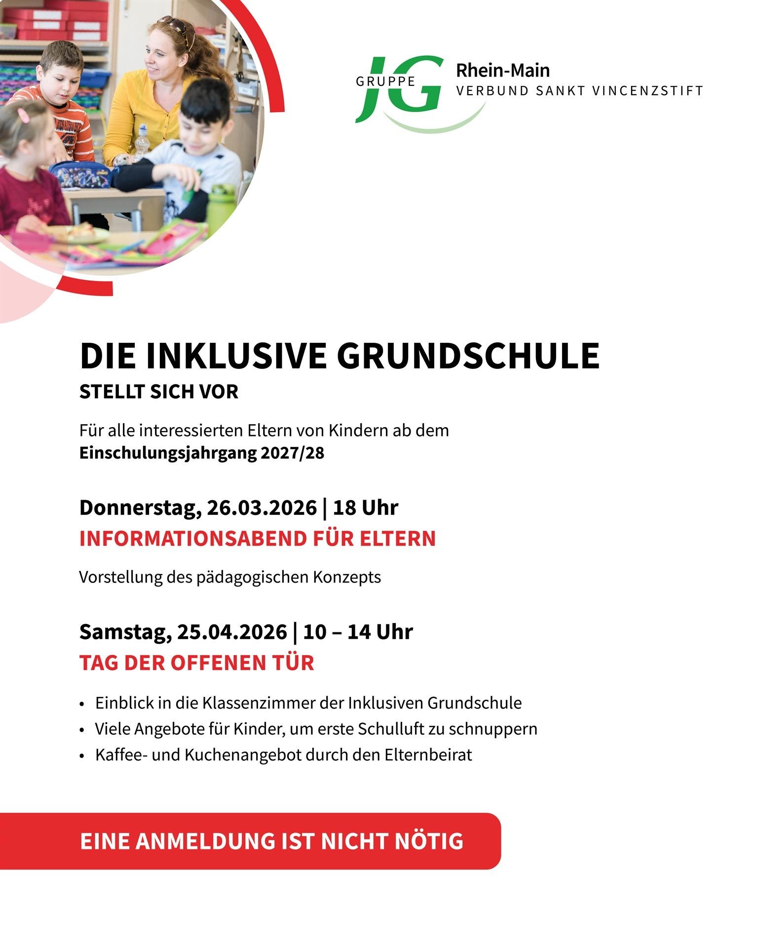 Rüdesheim-Aulhausen, 26. März 2026 – Eltern von Kindern des Einschulungsjahrgangs 2027/28 haben in den kommenden Wochen die Gelegenheit, die Inklusive Grundschule der Vincenzschule Aulhausen kennenzulernen. Im Rahmen eines Informationsabends sowie eines Tags der offenen Tür stellt sich die Schule vor und gibt Einblicke in ihr besonderes pädagogisches Konzept.